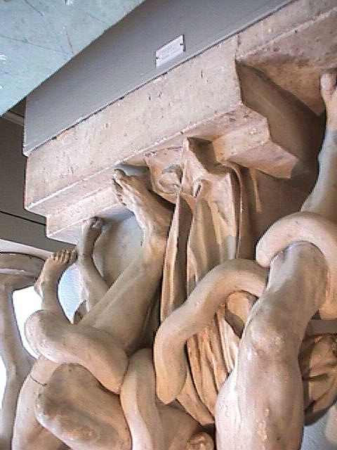 View of the same Curule Chair. The holes in site A formerly contained the metal tails of the aforementioned she-wolves, and served as bars to secure the bronze Sector B. On the band are these Letters of a Consul, i.e. Q. HORTENSIVS. P. F... N. COS. and it seems that there was the name of the other Consul, but the marble is corroded by time.
