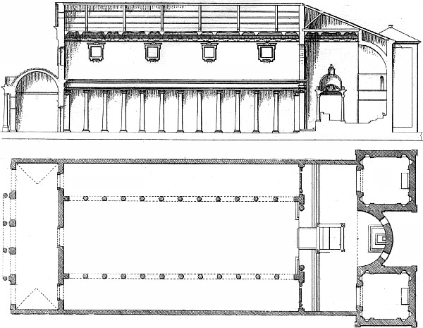 Longitudinal section and plan of the Church of Sta. Maria in trastevere; fourth century. The architrave and entablature are here regularly employed, and continued horizontally without break. Seroux