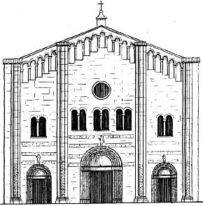Façade of the Church of St. Michael; it is remarkable for the coupled columns, and for the small arched gallery within the thickness of the wall parallel with the line of the roof, which are features in the architecture of the period, and observed also in St. John in Borgo at Pavia.