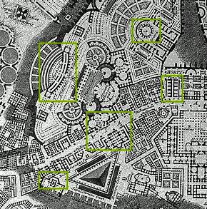 "...finally, the group dominated by the Bustum Caesaris Augusti, an imposing collection of regular and irregular geometric forms one grafted on to the other according to the law of opposition. (Attention is also called, in passing, to the appearance of two phallic-shaped planimetric organisms converging on the hexagonal atrium, which foreshadow, perhaps with no other intent than a pure ludus geometrico, the project of Ledoux's Oikema and some of Soane's typological notions.)