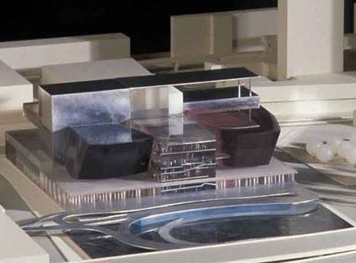 Public square at the end of a pier which shelters and boards passengers, and contains cultural and leisure facilities