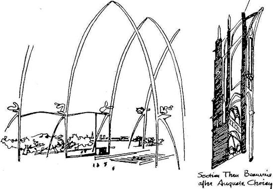| In 1941 Kahn entered into association with George Howe, and in 1942 Stonorov joined them. David P. Wisdom, who has been with Kahn ever since, entered the firm as a draftsman. Howe soon left the office to take up his duties in Washington as Supervisor of Building; but his name remained connected with the firm for some time. Howe, Stonorov and Kahn's Carver Court was one of the best housing developments built during the war years, but only the supporting masonry walls of the raised units in any way prefigure Kahn's later work. In 1944 Kahn published an article entitled "Monumentality." During the following decade such themes were to proliferate, reiterating the need felt by a deprived generation for grander architectural expression. Significantly, Kahn's was among the first. In it he characteristically concentrated upon structural possibilities but was still involved in the International Style aesthetic of maximum lightness and so proposed structures of welded steel tubing. In attempting to deal with a mode fundamentally unsympathetic to him, he turned rather desperately back to Choisy and to the latter's drawings of Gothic architecture, for which he had not cared much in the twenties. His own drawings recall those of Le Corbusier, which he apparently often traced in these years, and which themselves owed more to Choisy than either those of the Beaux-Arts as a whole or Kahn's own earlier sketches had done. Kahn was thus making fresh contact with the most useful side of his education through the influence of the most potent modern architect, and he himself dates his deep personal interest in Choisy from this time. His eventual integration of the wiry linearity characteristic of Choisy and Le Corbusier alike with the massive shadows of his earlier style can be seen in a comparison between the drawings discussed earlier. |