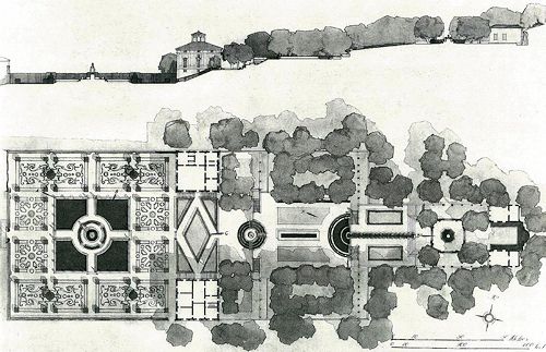 There is no inflection in the composition the Villa Lante, but an axis between the two equal pavilions, which focuses on a sculpture placed at a cross-axis, dominates the twin pavilions as a third element, thus emphasizing a whole.
