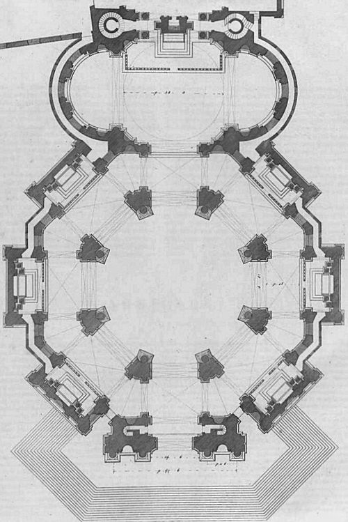 | The first mature expression of this creative ferment in the shape of a visionary plan occurs in: Piranesi's etched Pianta di ampio magnifico Collegio, included in the 1750 edition of his Opere Varie. This design originated in a highly imaginative synthesis of Palladian concepts, partly derived from Longhena's Santa Maria della Salute, and ideas drawn from the Roman Baroque of Borromini (notably from Sant'Ivo alla Sapienza), together. with a fund of inspiration gained from the complex planning of the Imperial thermae, then being surveyed by Piranesi.5 That this ambitious production was not a negative exercise is borne out by its contemporary influence on student designers in Rome such as Peyre and Robert Adam.6 Predictably, on the other hand, this ideal plan came under attack by the more conservative architects, as represented by Sir William Chambers's scathing reference to the Collegia in the 1791 edition of his Treatise on Civil Architecture.7 |