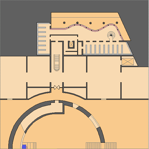 Evolutionary development of the curvaceous glass wall in concert with columns within the Stirling/Wilford oeuvre.