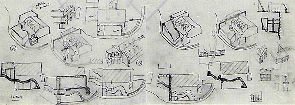 At the opposite end of the old mill the existing extension would be replaced by a new building (shop) which continues the passageway/arcade concept and the curving-arcade outside this shop could be used for window shopping and as a shelter for people waiting for buses--which may become more necessary if this area is developed for bus parking.