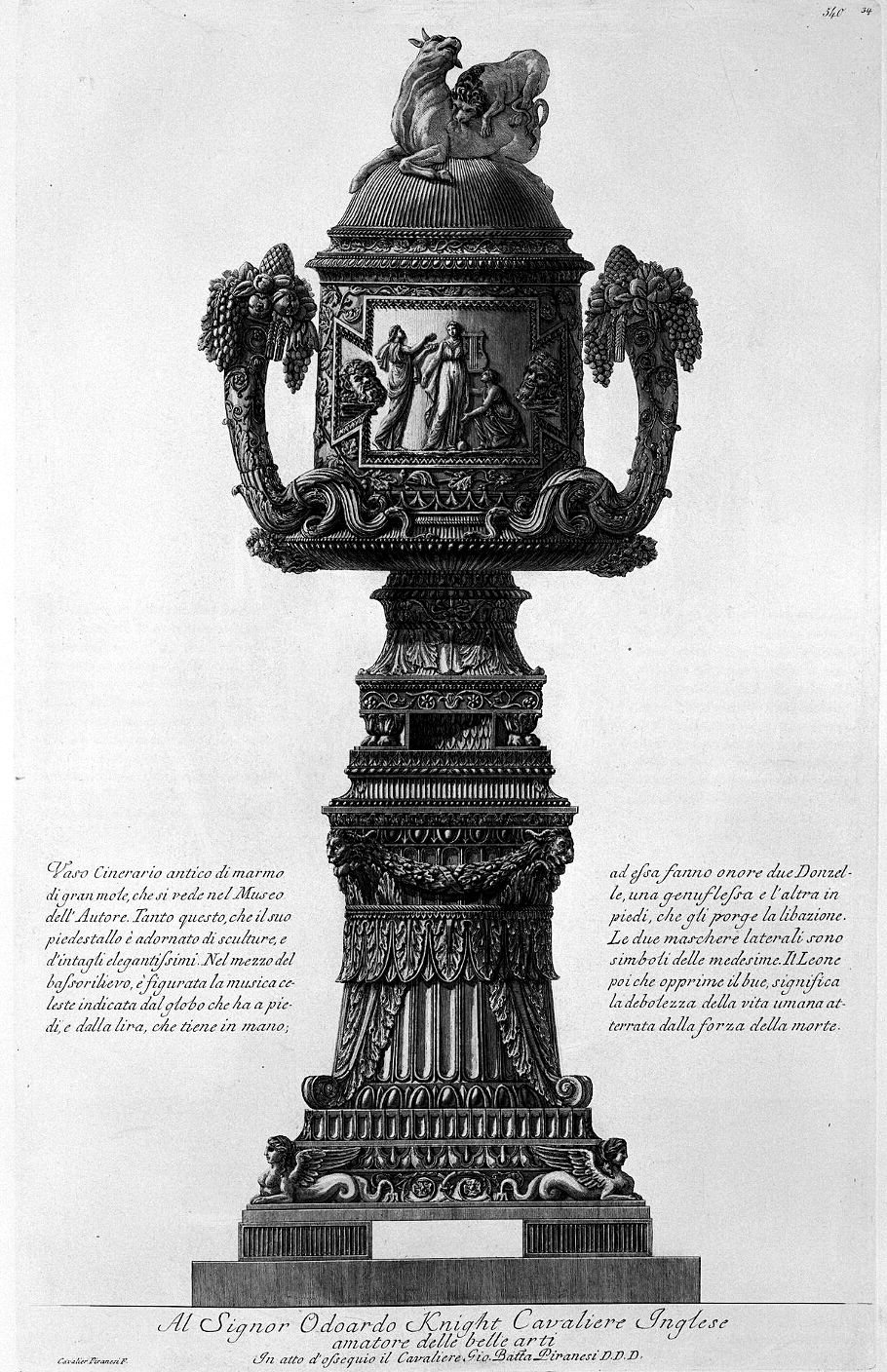 Ancient Cinerary vase of large marble, which can be seen in the Museum of the Author. So much so that its pedestal is adorned with very elegant sculptures and carvings. In the middle of the bas-relief, the celestial music is represented, indicated by the globe on foot, and by the lyre, which he holds in his hand; two damsels do it honor, one kneeling and the other standing, offering him the libation. The two side masks are symbols of the same. The Lion then oppressing the ox, signifies the weakness of human life landed by the force of death.