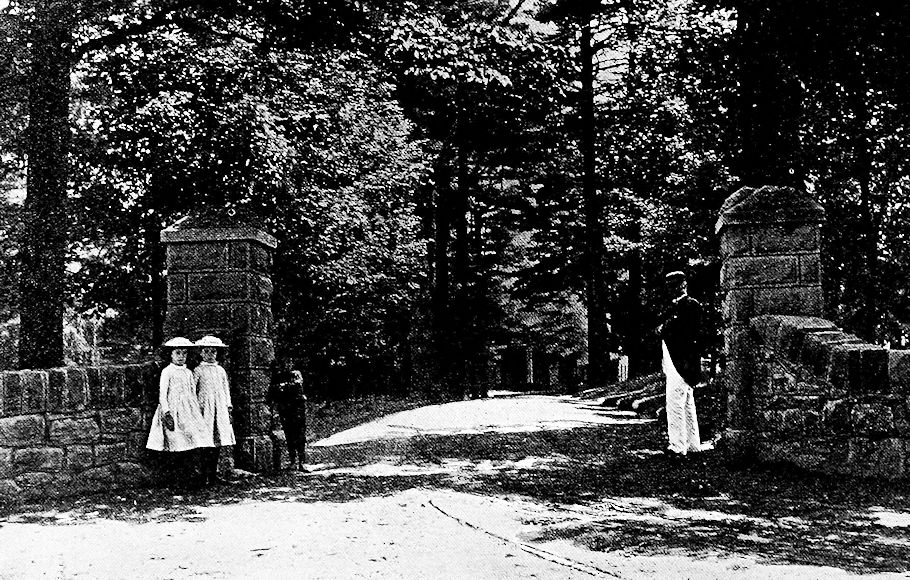 The approach to Ury House is by a broad avenue four hundred feet in length, of venerable pines upward of one hundred years of age. The visitor enters through a pillared porch and broad low hall with heavy rafters, which is heated by a large open fireplace surmounted by a mantle of antique design.
