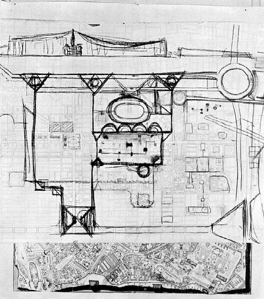 Kahn's Market Street East Development sketch plan superimposing Piranesi's Ichnographia Campus Martius dates from 1961-62.