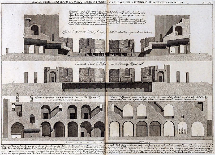Figure III. A. Orchestra entrance arch. B. Niches of the statues described in Plate V. C. Arch of the main staircase. D. Fenestra for its light. E. Arches of the Portico. F. Closed sayings. G. Second-order rooms. H. Scala, which from the Corridore dé Vomitori rises to the second precinct. I. Others, which rise to the top of the Theatre.