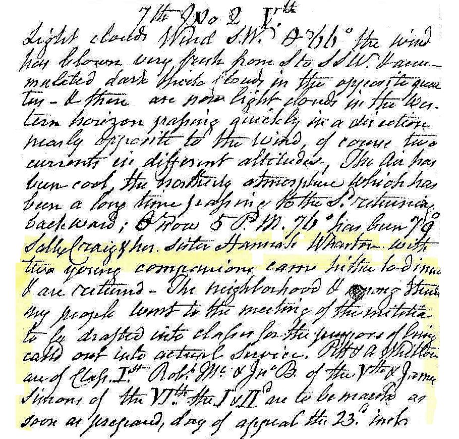 Light clouds, wind SW, temperature 66°. The wind has blown very fresh from S to SSW and accumulated dark thick clouds in the opposite quarter. And there are now light clouds in the western horizon passing quickly in a direction opposite to the wind, of course, two currents in different altitudes. The air has been cool, the northerly atmosphere which has been a long time passing to the S returning backwards. Temperature now 5 PM 76°, has been 79°. Sally Craig and her sister Hannah Wharton with two young companions came hither to dinner and are returned. The neighborhood and among them my people went to the meeting of the militia to be drafted into classes for the purpose of being called out into actual service. Pitt and Whilton are of Class 1st, Robert Mc and J. B. of the 5th, and James Simons of the 6th. The 1st and 2nd are to be marched as soon as prepared, day of appeal the 23rd ....