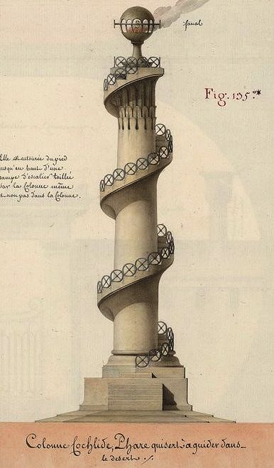 distorted forms on the Pompe à feu; | and the Powder Magazine. | In the last two designs the roof lines are transformed into features of great expressiveness: mute matter here speaks of restive elements. The winding stairs of the Beacon (Colonne cochlide) also have become a fanciful, oversized pattern. |