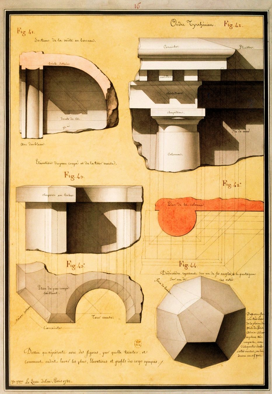 index 1782. 41 Section of barrel vault. 42 Tuscan ordcr. 42° Plan of column. 43 Elevation of chamfer and hollow shaft. 44 Dodecahedron resting on one of its angles, and pentagon on one 0f its sides.