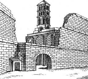 View of the three columns of Temple of Mars the Avenger at Rome, above them the tower of a monastery. Seroux